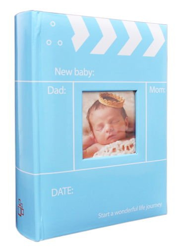 Niebieski album, z możliwością opisania na okładce imienia dziecka, matki, ojca oraz daty urodzenia.