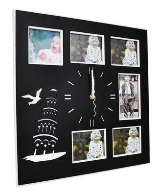 - Unikalny kwadratowy zegar z miejscami na zdjęcia lub obrazki. Zegar z wycięciem w kształcie krzywej wieży oraz mewy. Idealnie nadaje się jako prezent. Znakomicie sprawdzi się w domu i w biurze jako elegancki dodatek wnętrza.